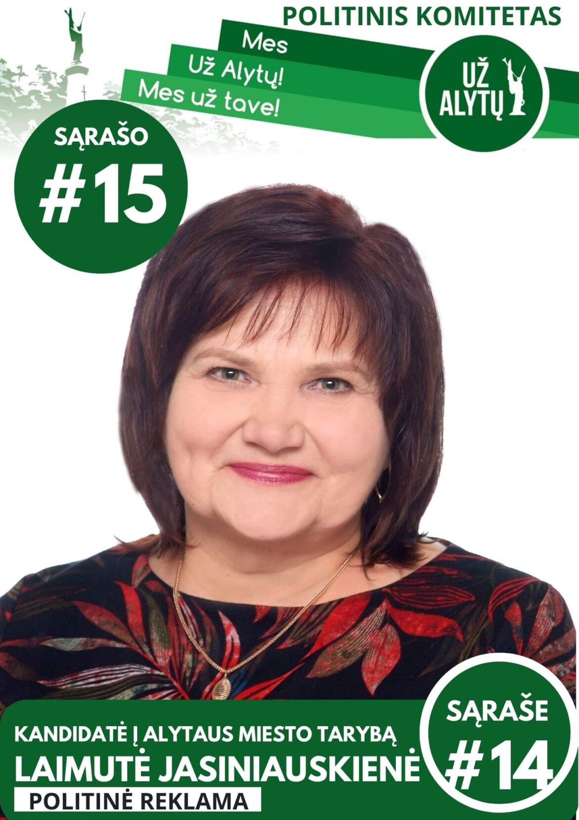 Balsuokite už Laimutę Jasiniauskienę Nr. 14 Politinio komiteto „Už Alytų“ sąraše Nr.15!