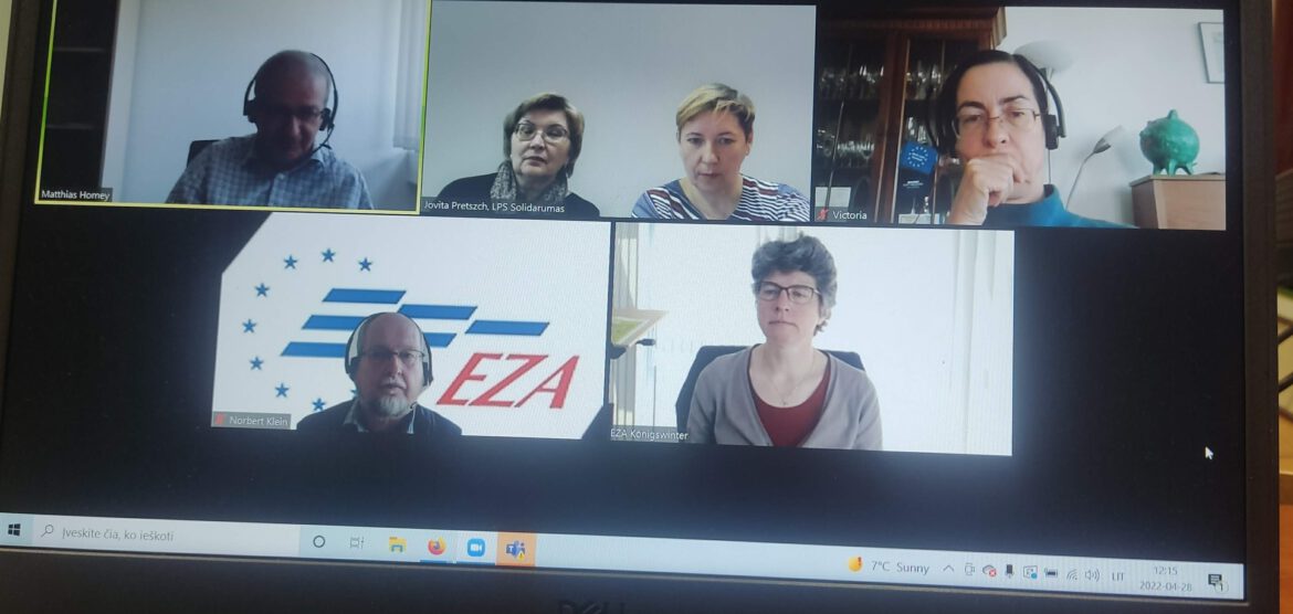 2022 m. balandžio mėn. 28d. įvyko Europos darbuotojų centro EZA nuotolinis susitikimas dėl suvažiavimo, kuris vyks šiais metais Lietuvoje. Susitikime dalyvavo LPS ,,Solidarumas” pirmininkės pavaduotoja Jovita Pretzsch, EZA viceprezidentė Janina Švedienė, EZA generalinės sekretorė Sigrid Schraml ir kiti EZA ekspertai.