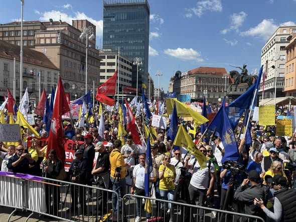 2026 m. balandžio 18 d. Kroatijos sostineje Zagrebe vyko tūkstantinė protesto akcija. Akciją organizavo profesinės sąjungos ir pensininkai. Šio protesto priežastys atspindi platesnius struktūrinius iššūkius, su kuriais susiduria darbuotojai ir pensininkai Kroatijoje, ir daugelis jų jaučiami visoje Europoje. Nepaisant daugelio metų nuolatinio ekonomikos augimo, šio augimo nauda nebuvo paskirstyta teisingai. Atlyginimai didėjo, bet gerokai lėčiau nei įmonių pelnas, o tai reiškia, kad darbuotojai negauna teisingos dalies už savo kuriamą vertę. Pensininkai yra vieni labiausiai nukentėjusių. Vidutinės pensijos sudaro tik apie trečdalį vidutinio darbo užmokesčio, o nemaža dalis vyresnio amžiaus piliečių gresia skurdas. Proteste dalyvavo apie 70 000 žmonių.