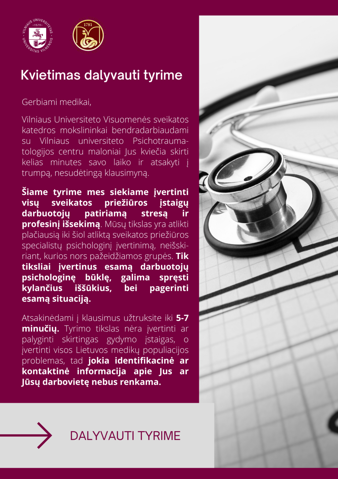 Šis tyrimas yra skirtas Lietuvoje dirbantiems visų sričių ir specialybių medicinos darbuotojams teikiantiems sveikatos priežiūros paslaugas (gydytojams, slaugos darbuotojams ir kitiems specialistams). Šia anketa yra siekiama įvertinti bendrą sveikatos priežiūros įstaigų darbuotojų psichologinę savijautą, o ne įvertinti atskiras Lietuvos įstaigas, todėl jokia kontaktinė, identifikacinė informaciją apie darbuotoją ar jo darbovietę nėra renkama. Anonimiškumas ir konfidencialumas yra garantuojamas tyrėjų. Prieigą prie Jūsų duomenų turės tik tyrėjai. Tyrimo platforma atitinka Europos sąjungos duomenų apsaugos reglamentą. Duomenys bus tvarkomi ir saugomi remiantis Lietuvos respublikos Asmens Duomenų Apsaugos įstatymu ir Vilniaus universiteto dokumentų saugojimo ir tvarkymo dokumentais.