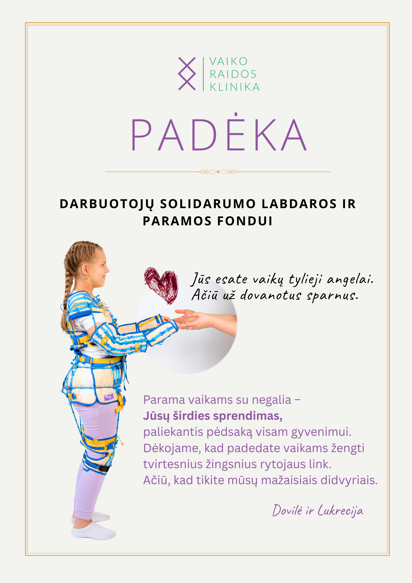 Iš visos širdies dėkojame, kad esate mūsų kelionės dalis. Linkime Jums stiprybės, sveikatos ir to paties šviesaus gerumo, kurį taip dosniai dalinate kitiems”.