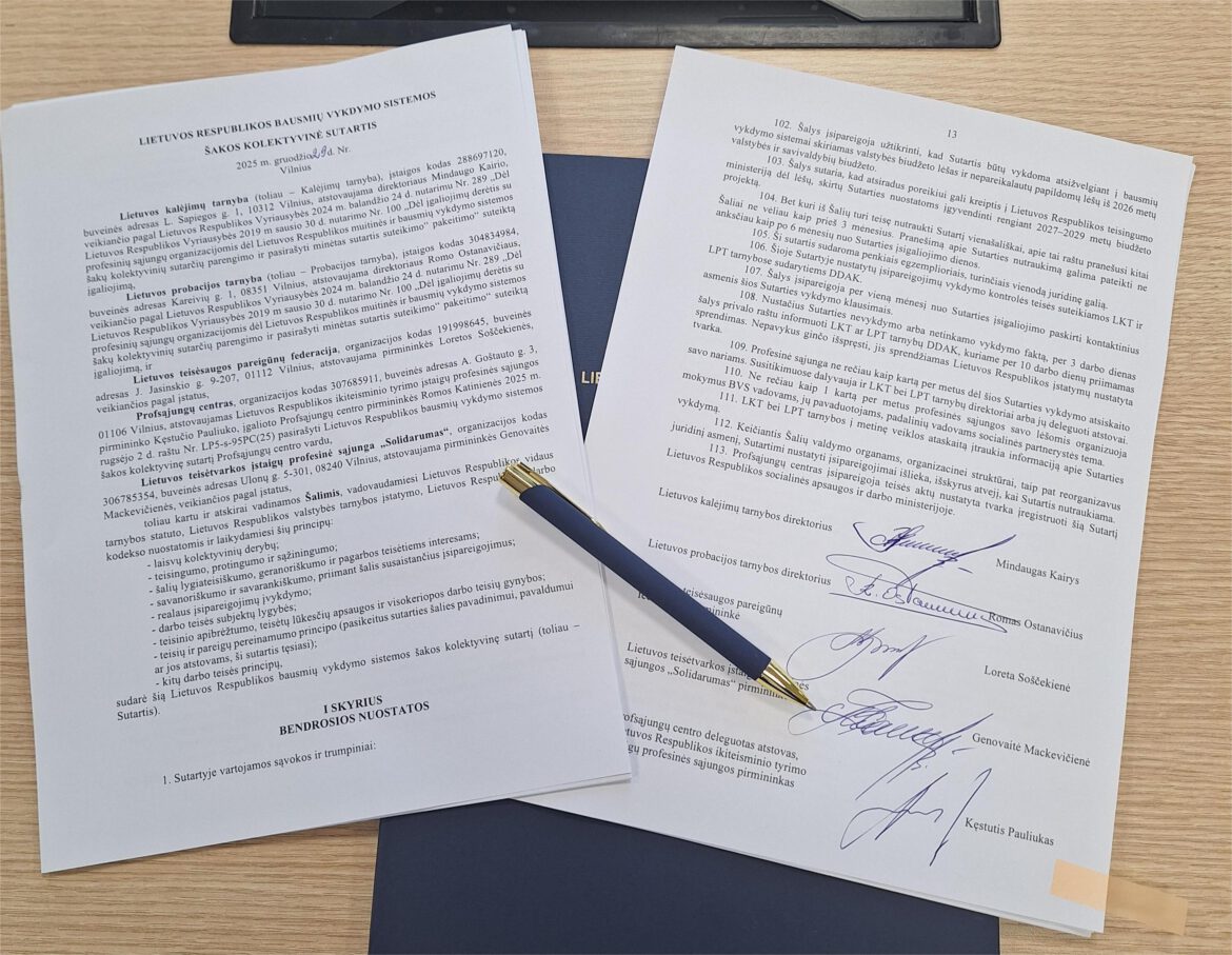 2025 m. gruodžio 29 d., Lietuvos kalėjimų tarnyba, Lietuvos probacijos tarnyba, Lietuvos teisėsaugos įstaigų profesinė sąjunga „Solidarumas“, Lietuvos teisėsaugos pareigūnų federacija, Profsąjungų centro deleguota Lietuvos Respublikos ikiteisminio tyrimo įstaigų profesinė sąjunga pasirašė Lietuvos bausmių vykdymo sistemos šakos kolektyvinę sutartį.