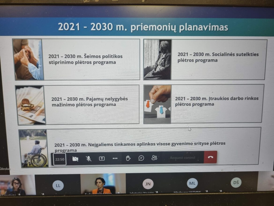 2021 lapkričio 23 d. vyko nuotolinis darbo grupės klausimams, susijusiems su Europos socialinių teisių ramsčio įgyvendinimu, koordinuoti ir spręsti (ESTR DG), posėdis. Posėdį pradėjęs grupės vadovas LR Socialinės apsaugos ir darbo viceministras Vytautas Šilinskas trumpai pristatė Europos socialinių teisių ramsčio veiksmų planą, siektinus ES ir Lietuvos rodiklius bei numatytus tikslus. Artimiausios priemonės, kurias ketinama įgyvendinti Lietuvoje yra: pensijų didinimas, MMA didinimas, bazinių dydžių didinimas, vienišo asmens išmoka, didesnės išmokos globojamiems (rūpinamiems) vaikams, užimtumo rėmimo reforma. Ilgalaikiai strateginiai tikslai: Šeimos politikos stiprinimo plėtros programa, Pajamų nelygybės mažinimo plėtros programa, Socialinės sutelkties plėtros programa, Įtraukios darbo rinkos plėtros programa, Neįgaliems tinkamos aplinkos visose gyvenimo srityse plėtros programa. Viceministras išskyrė tris sritis, kuriose reikalinga daugiausia pažangos, tai yra: užimtumas, mokymasis visą gyvenimą ir skurdo bei atskirties mažinimas. Lietuva įsipareigojo, jog iki 2030 m. darbą turėtų turėti ne mažiau kaip 80,7 proc. 20-64 metų amžiaus gyventojų. Nuo 13 iki 9 proc. turėtų mažėti nesimokančio ir nedirbančio (NEET) 15-29 m. amžiaus jaunimo dalis. Asmenų, patiriančių skurdo riziką ar socialinę atskirtį, iki 2030 m. turėtų sumažėti bent 142 tūkst.. Lietuvoje 2019 m. skurdo rizikoje ar socialinėje atskirtyje buvo 734 tūkst. žmonių, iš kurių 120 tūkst. – vaikai iki 16 m..